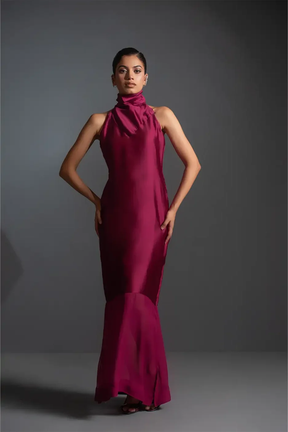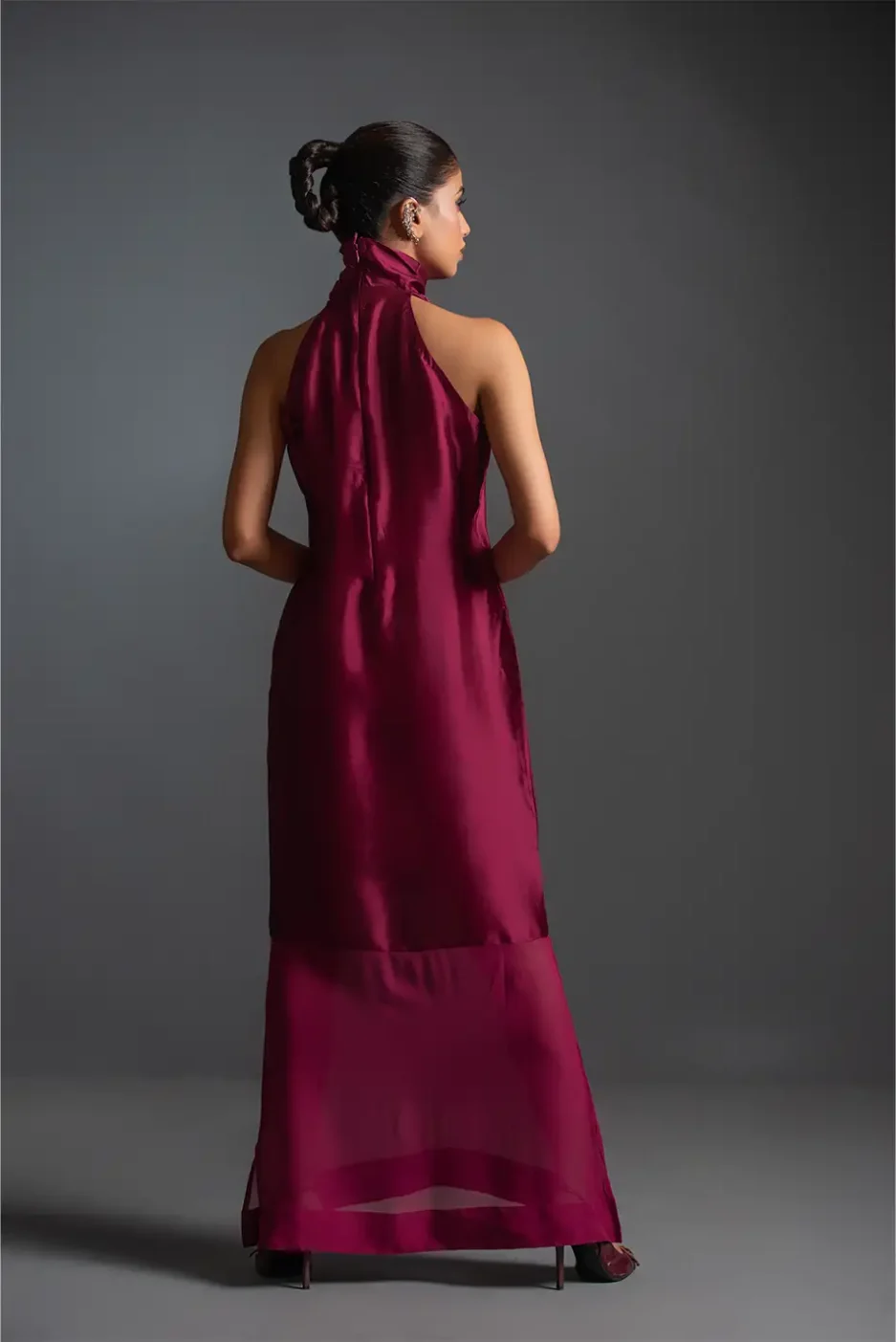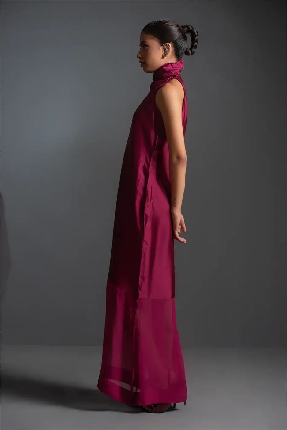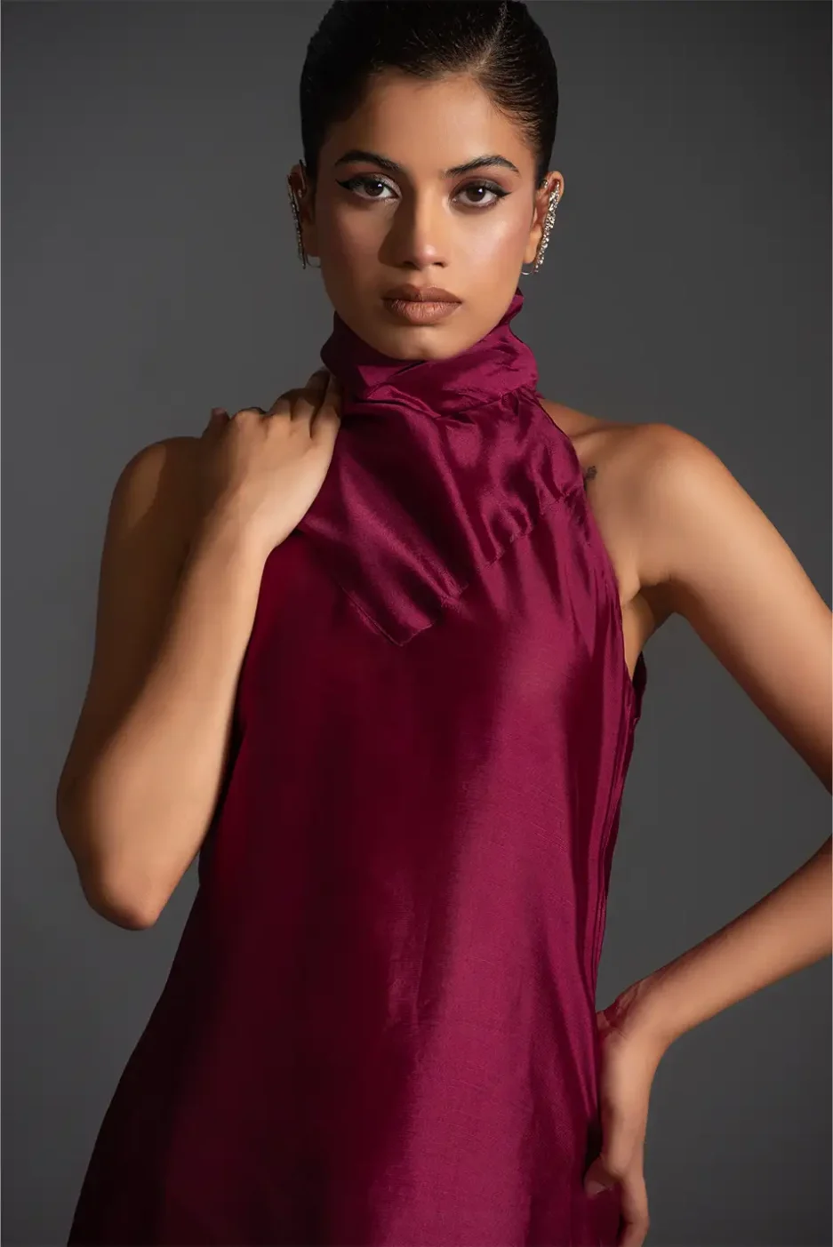 Turn heads in the Crimson Dream dress, crafted from luxurious pure, raw silk in a deep wine hue. Featuring a high neckline, sleeveless cut, and a flowing hemline, this dress is the perfect blend of elegance and edge. Ideal for formal events or evening occasions.