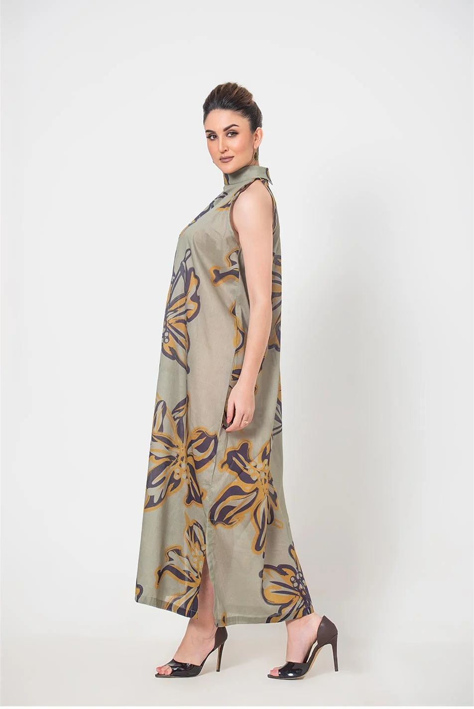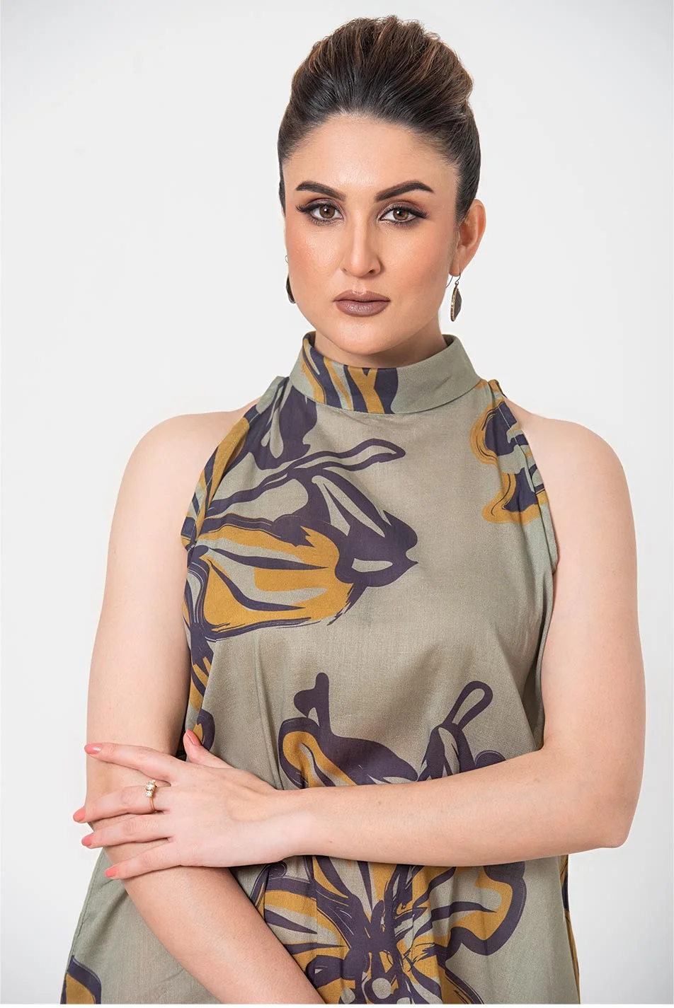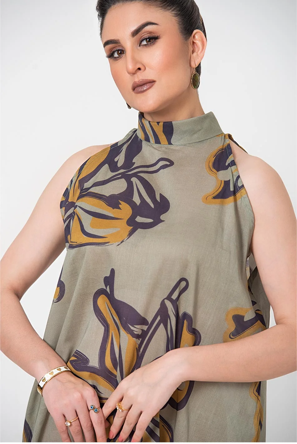 This shirt combines a soft cotton feel with a bold print of yellow and purple flowers for a striking look. Featuring a simple straight cut, sleeveless design, and a side slit near the bottom, it’s perfect for a breezy, stylish ensemble with a touch of floral flair.