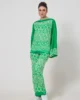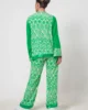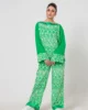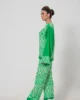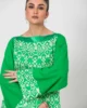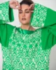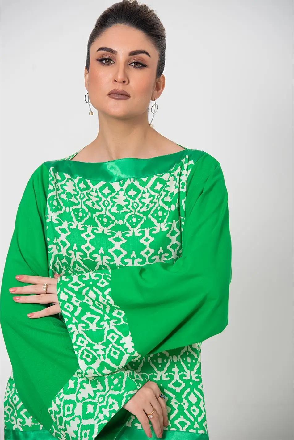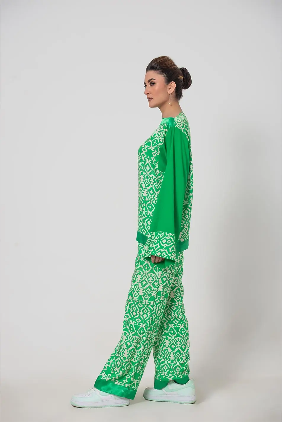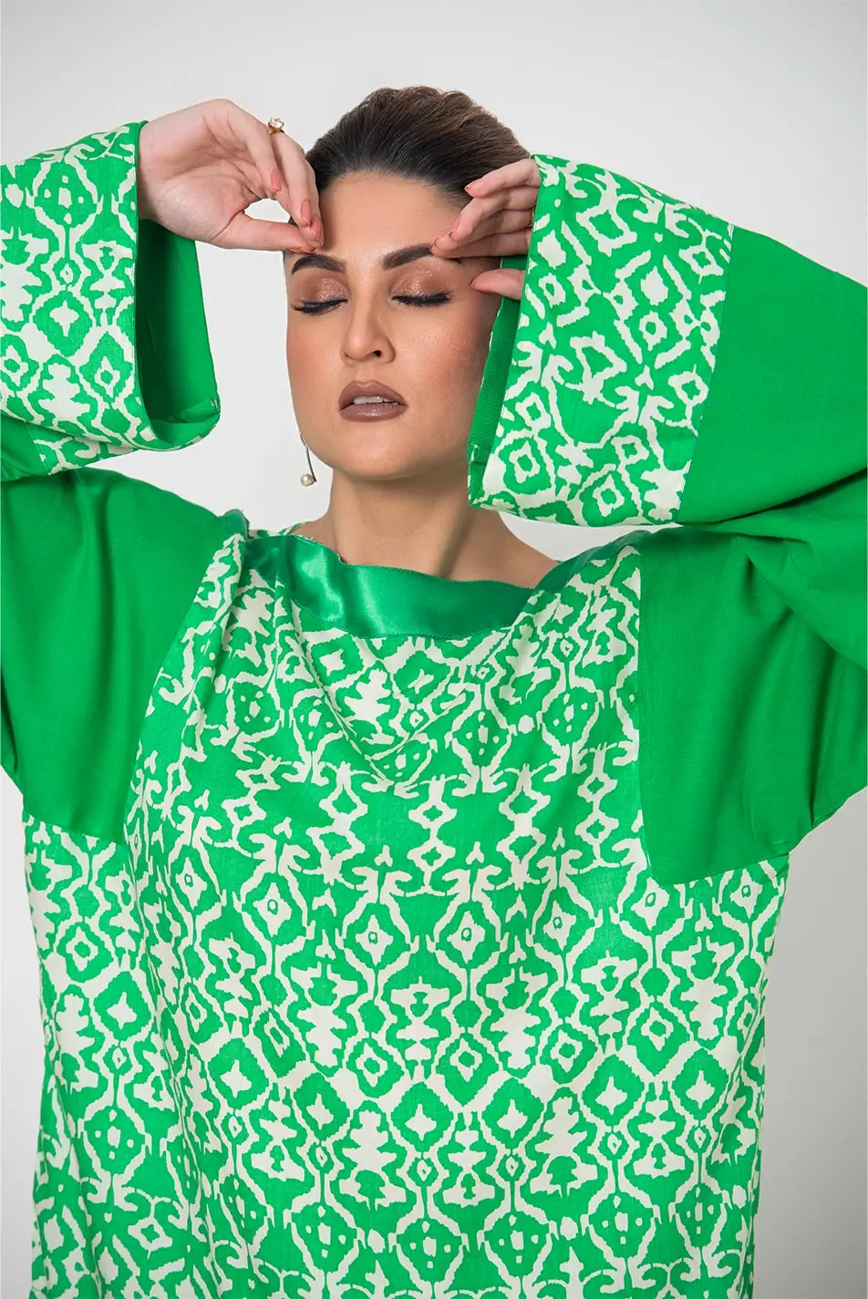 This bright green and white printed co-ord set exudes a playful vibe with its bold pattern and fresh color combination. The plain green sleeves with a printed border add a fun contrast, while the broad neckline and light, breathable material ensure comfort and style. Perfect for effortless, chic looks all season long.
