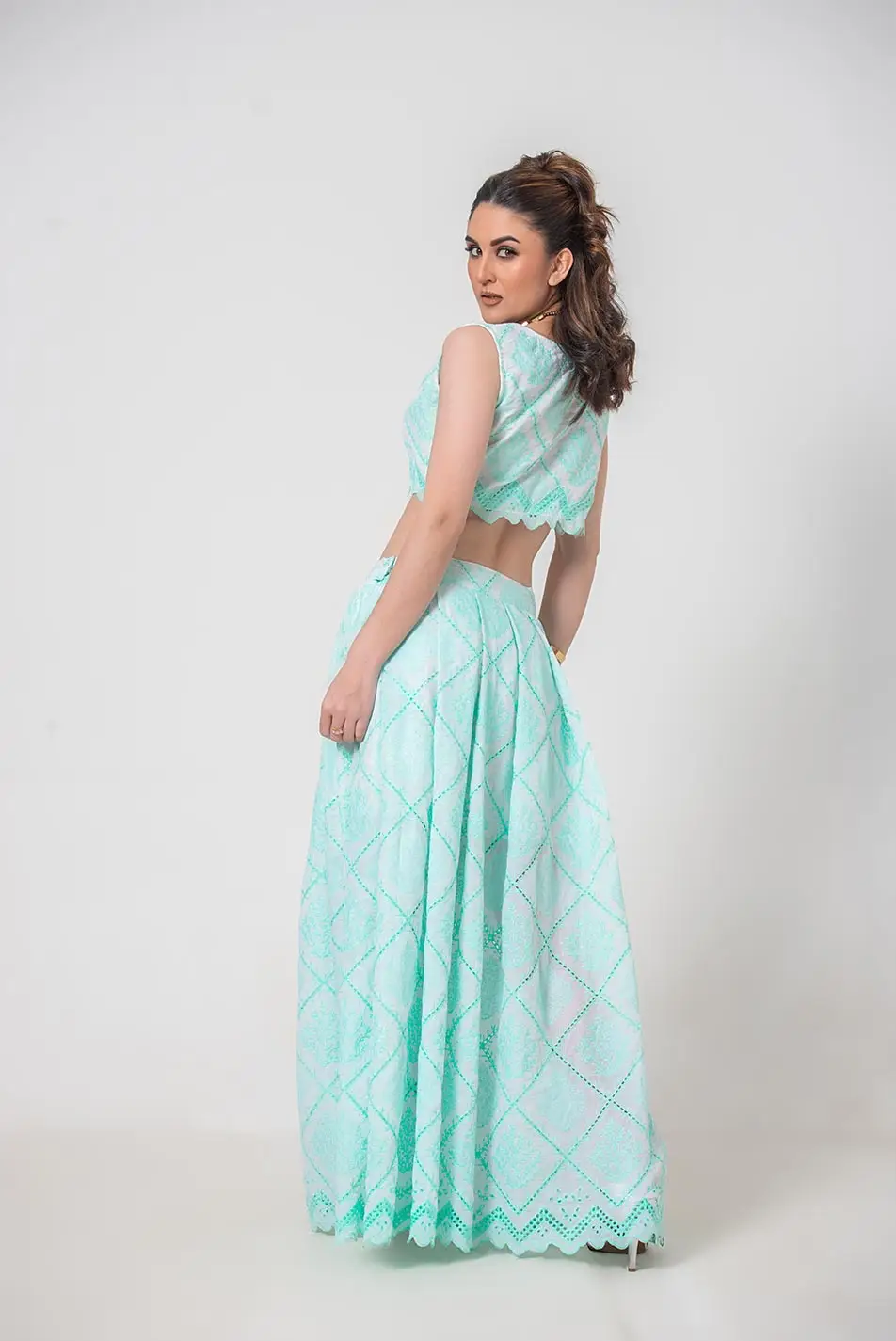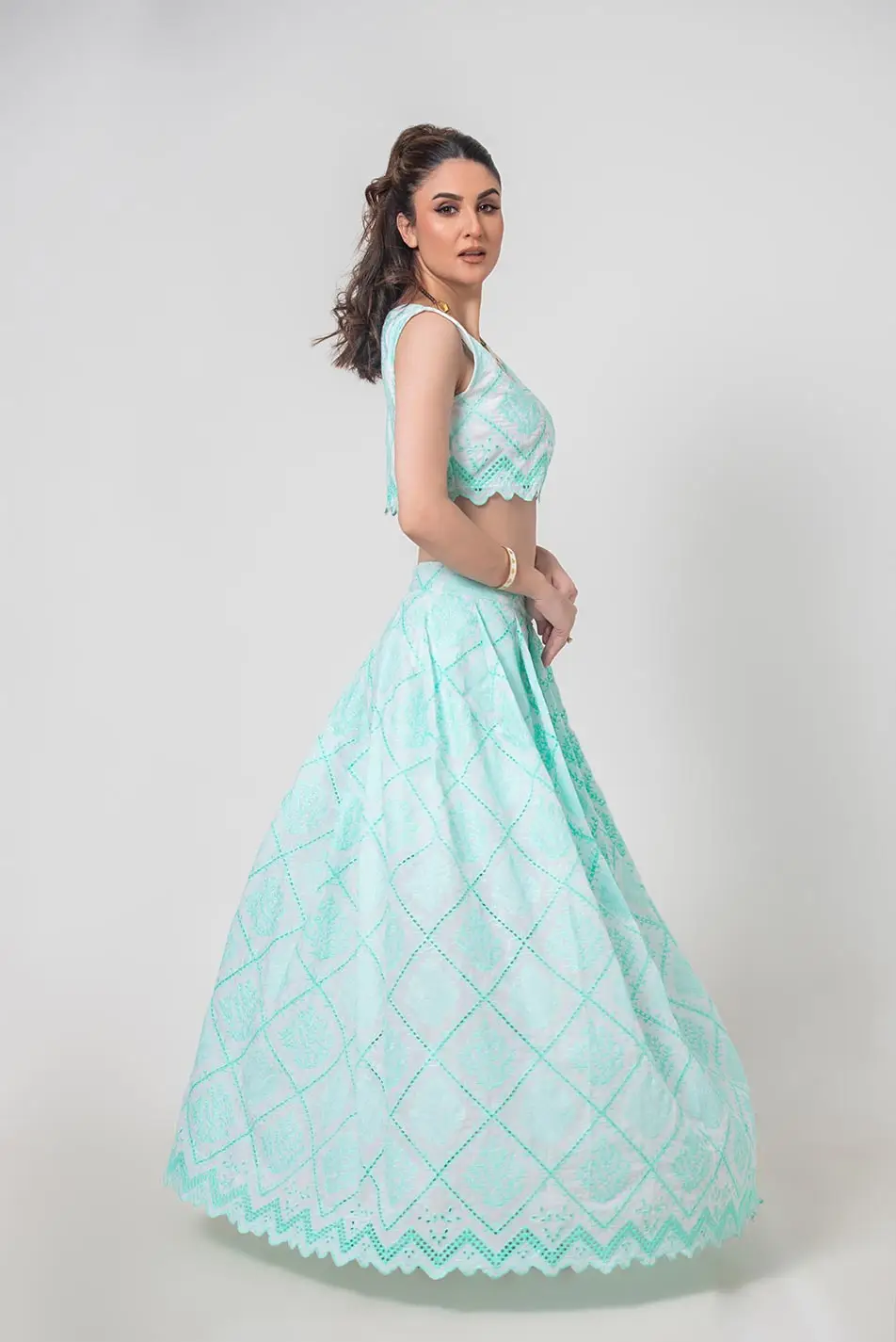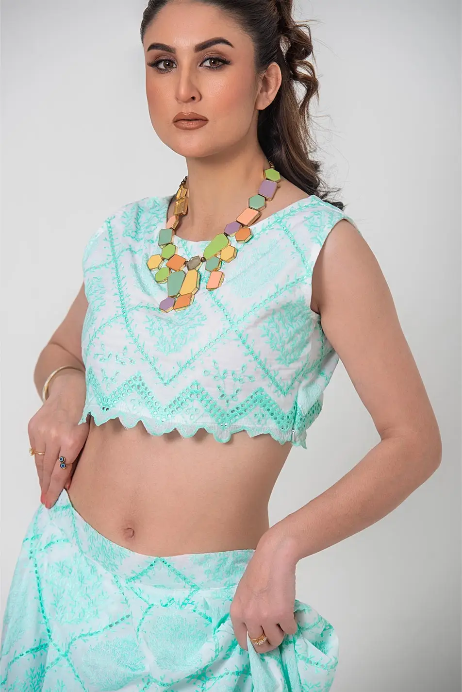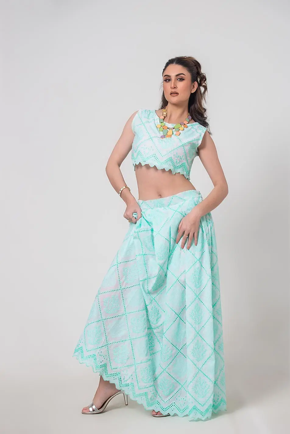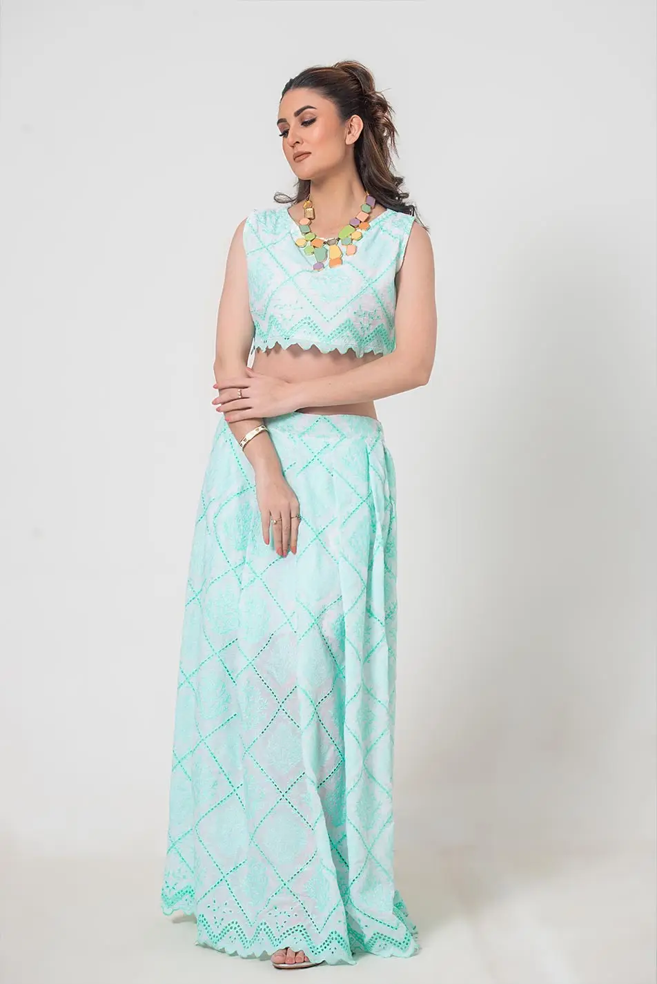 Top: Intricate mint chikankari embroidery adorns this top, adding a touch of timeless elegance. The broad neckline offers a modern twist, while the delicate embroidery creates a stunning contrast, perfect for those who appreciate understated beauty. A chic and versatile piece, this top is ideal for pairing with jeans, skirts, or layering with your favorite accessories.