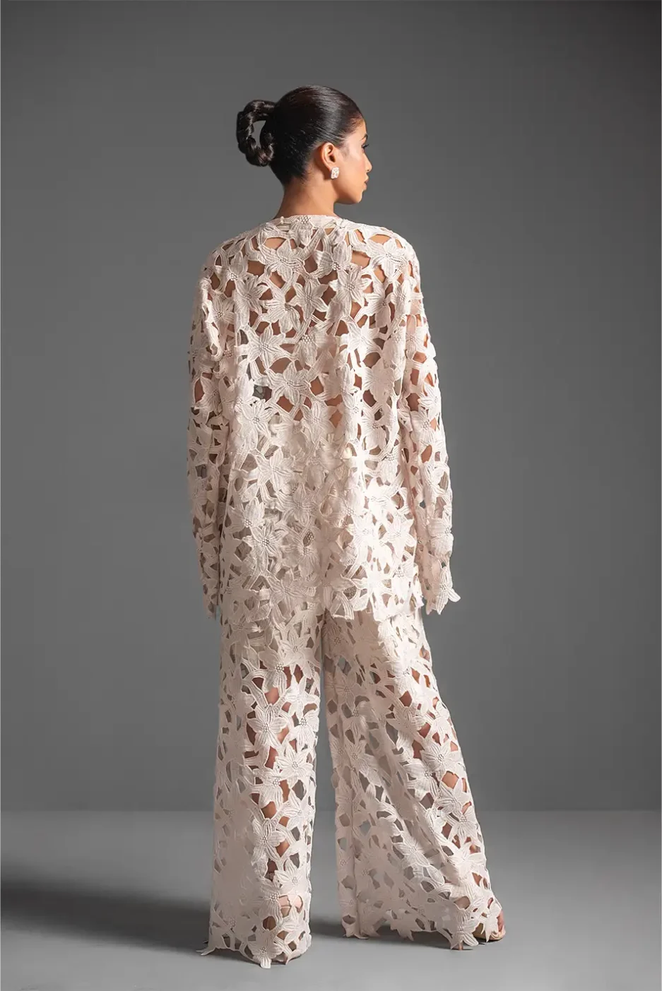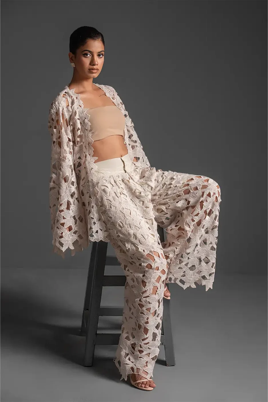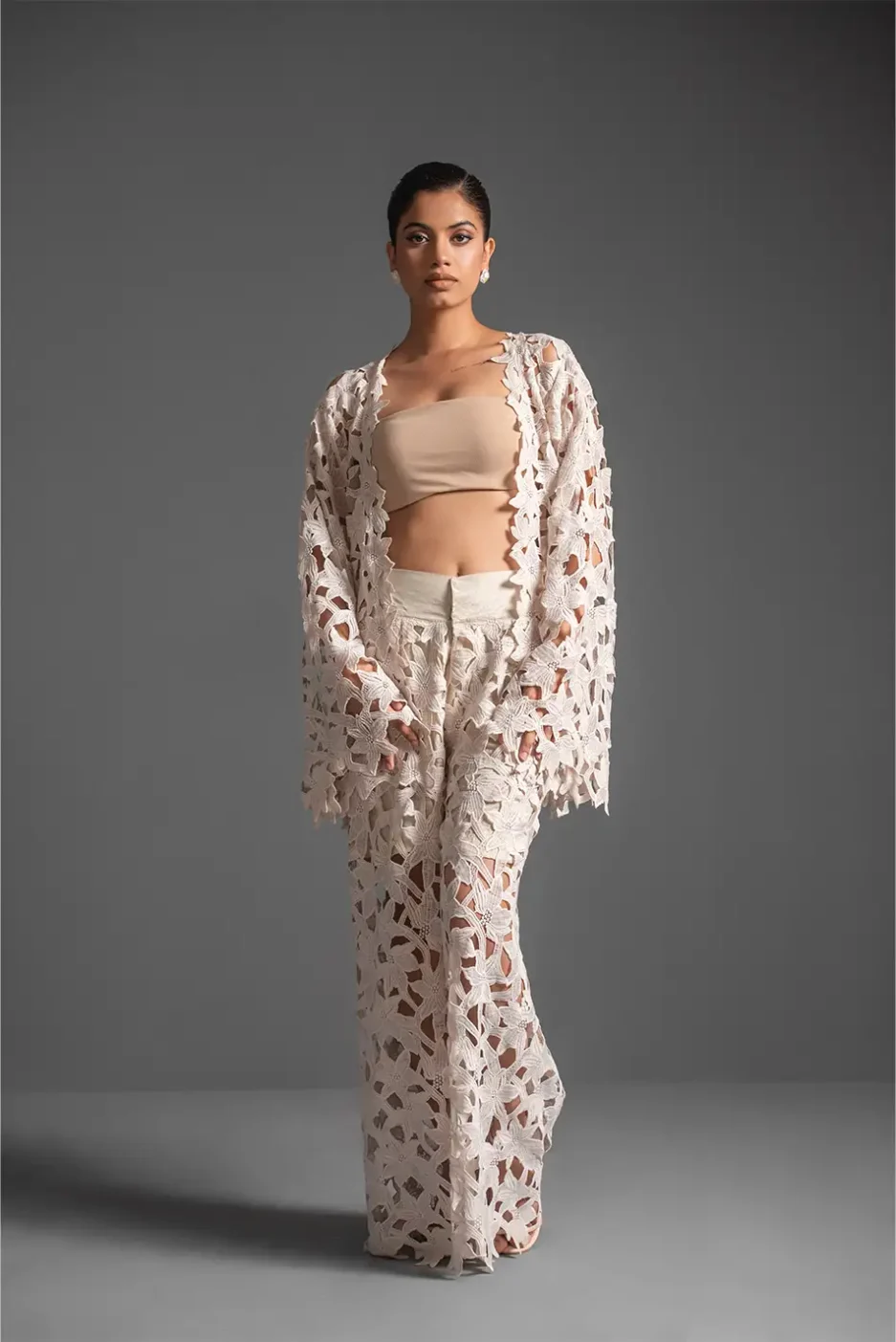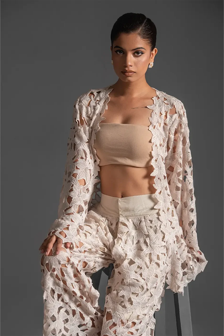 Unapologetically bold, THE VOID is a two-piece statement set crafted from oversized floral lace with open spaces and no lining. The long coat and tailored trouser silhouette balance structure with exposure, creating a play between presence and absence. Designed without compromise and without distraction – the tube top isn’t part of the set. This is confidence, unlined.